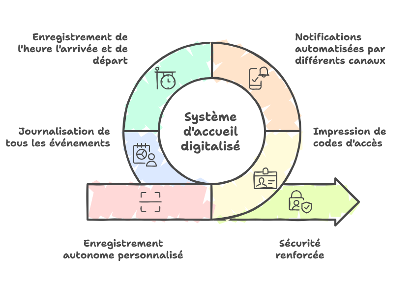 Ce processus, entièrement automatisé, simplifie et accélère l’accueil, offrant une expérience fluide et professionnelle à chaque visiteur.