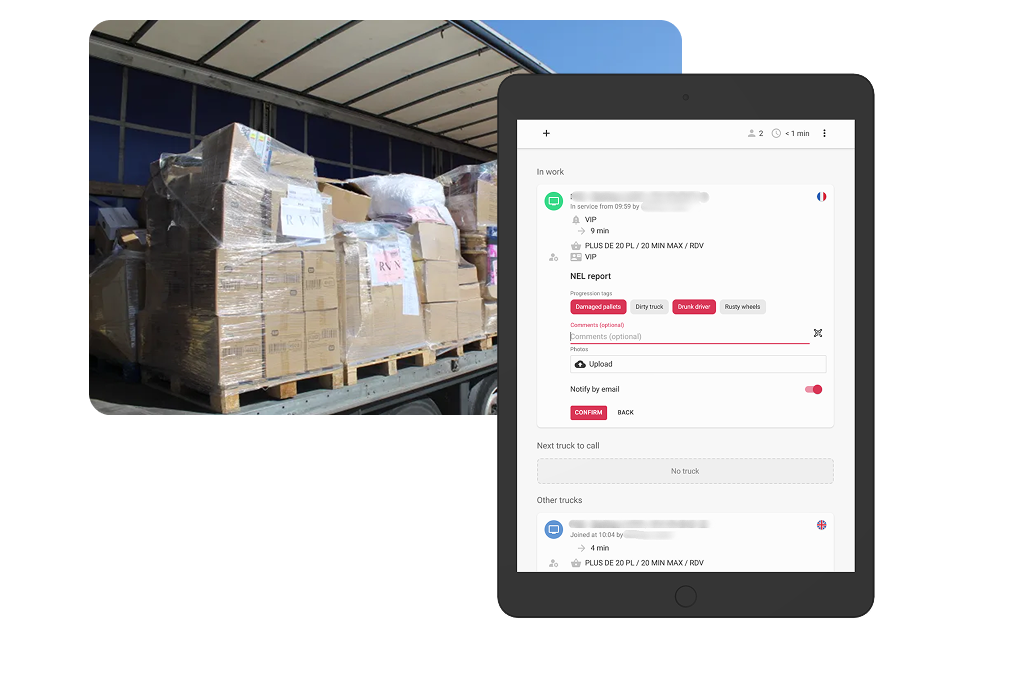 Optimize your truck flows with real-time management of arrivals, departures, and dock assignments.